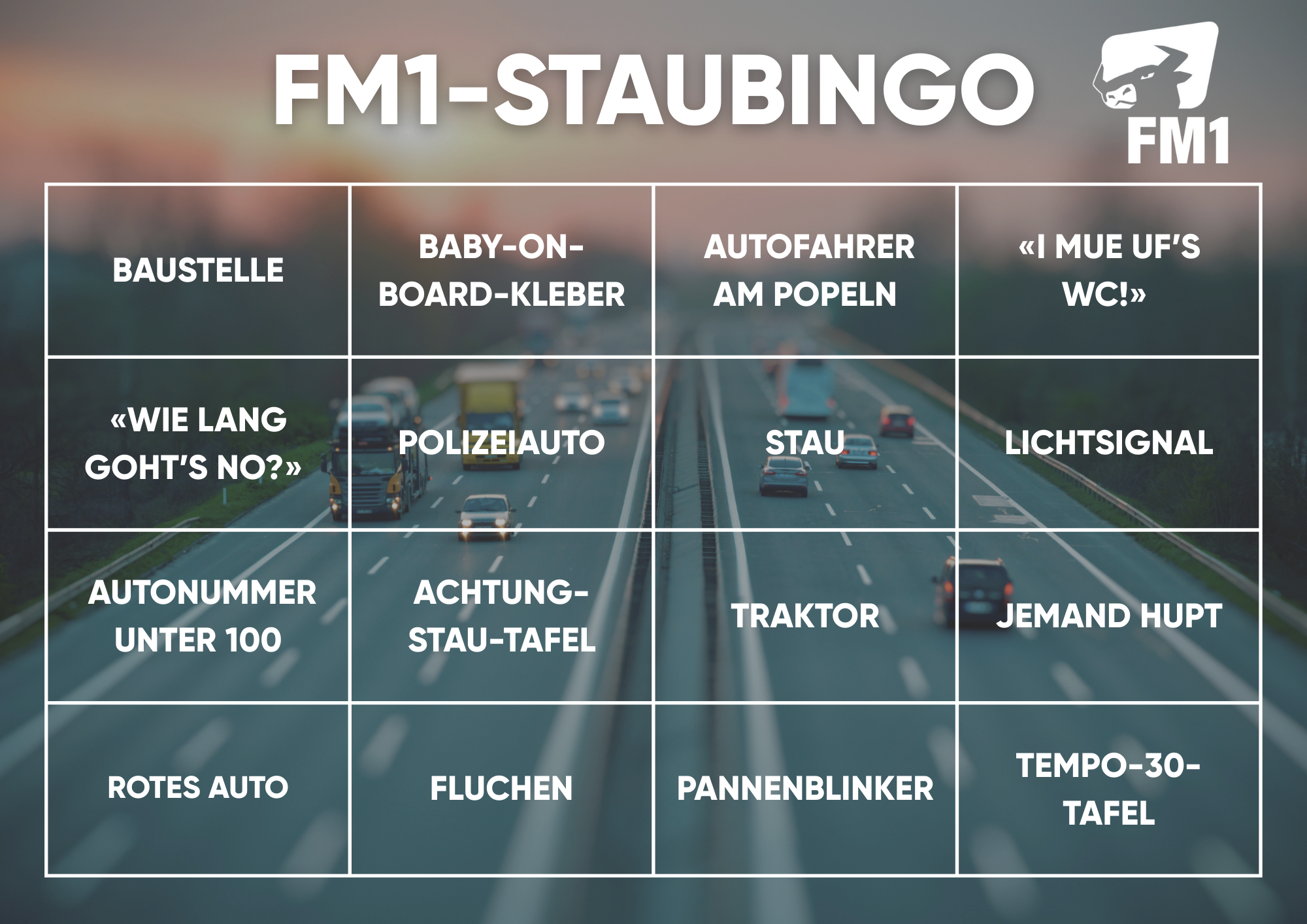 Fährst du über Pfingsten mit dem Auto in die Ferien? Dann lade dir jetzt die FM1-Staubingo-Karte herunter – und die Langeweile auf der Fahrt ist wie weggeblasen! Sobald du etwas von der Karte auf oder neben der Strasse siehst: einfach abkreuzen. Mit etwas Glück schaffst du ein Bingo!