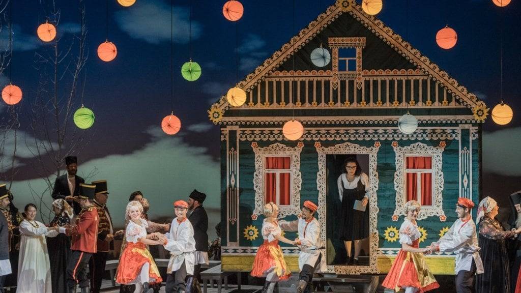 Die Bühnenausstattung von Susanne Gschwender ist unaufdringlich aber sehr wirkungsvoll. In den ersten beiden Akten steht das idyllische Landleben mit blauem Himmel, an dem dank Videoprojektion echte Wolken vorbeiziehen und einem kleinen, herzig verzierten Häuschen im Zentrum. Das Häuschen lässt sich drehen und gibt den Blick frei in Tatjanas Mädchenzimmer, wo sie sich zwischen den aufgereihten Puppen einer Matroschka dem Liebeskummer hingibt.