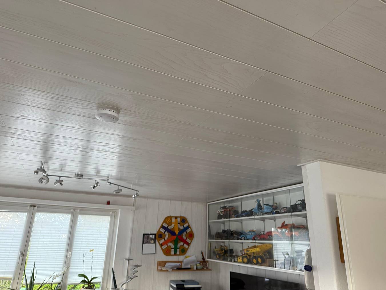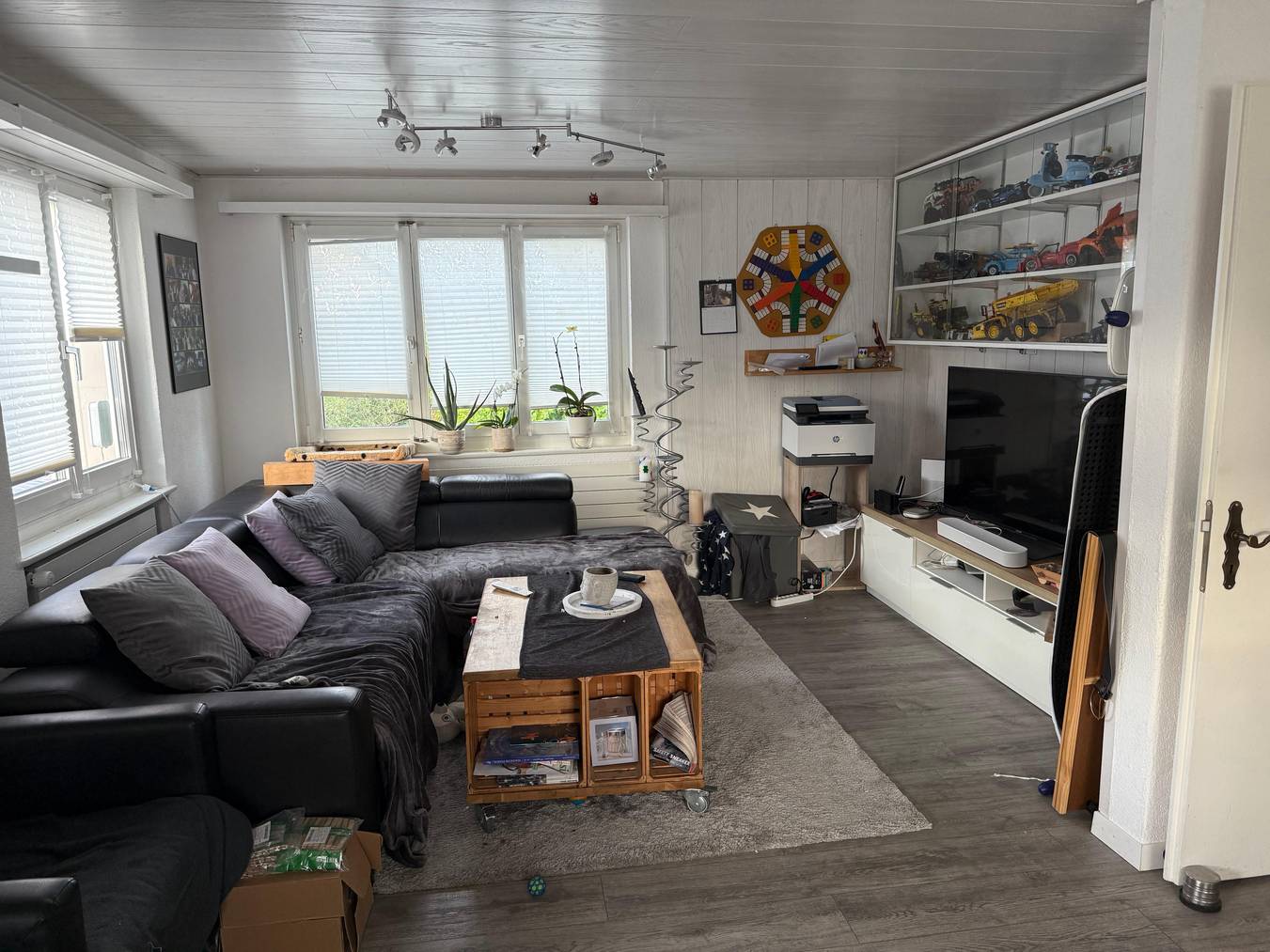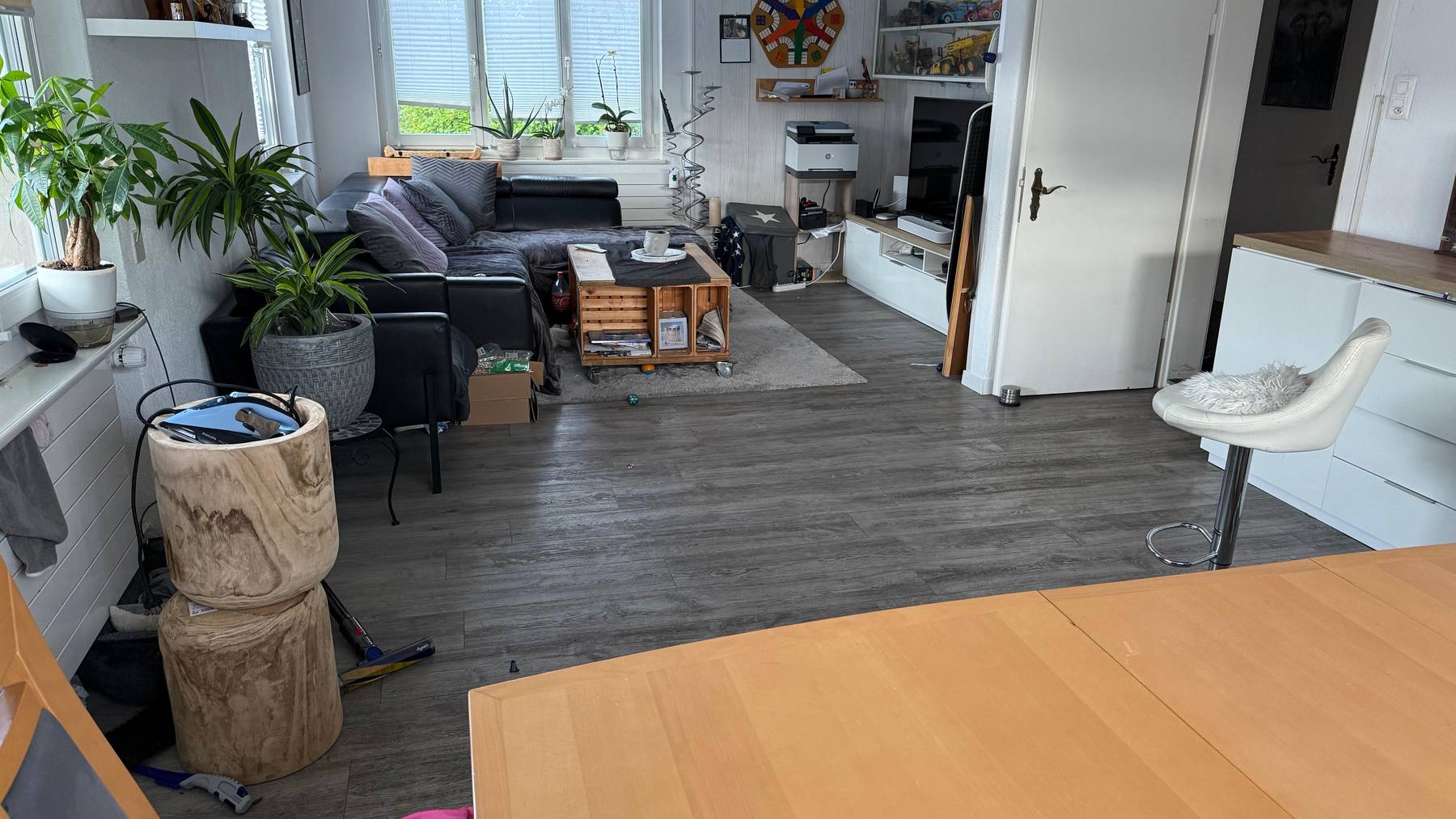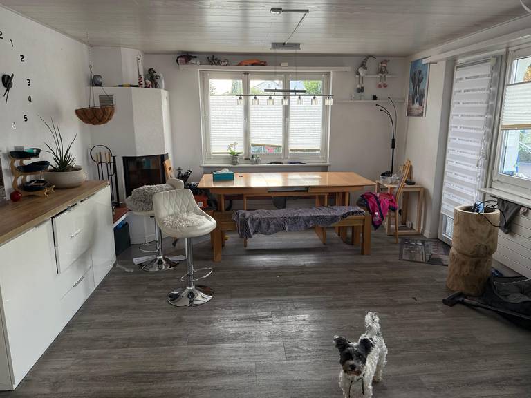 Unsere Stube teilt sich mit dem essbereich der Vorgänger hat leider beim trennen der Zwischenwand den stahlträger eingesetzt nun ist der Boden nicht gerade . Sie Wände und Decke sind aus weissem lasiertem holz . Die fenstersimse sind kaputt