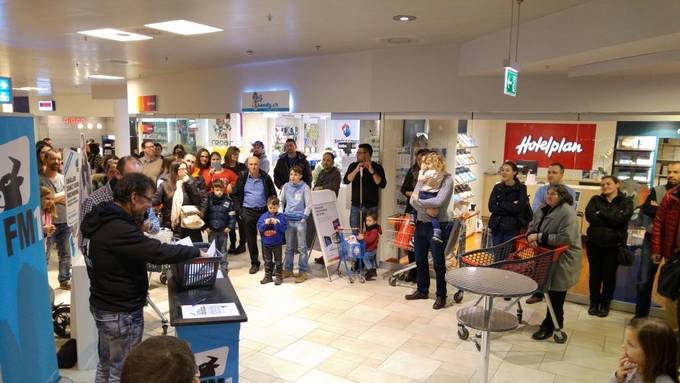 Hier zahlt Chäller FM1-Hörerin Andrea aus Sevelen die Einkäufe im Pizolpark zurück.